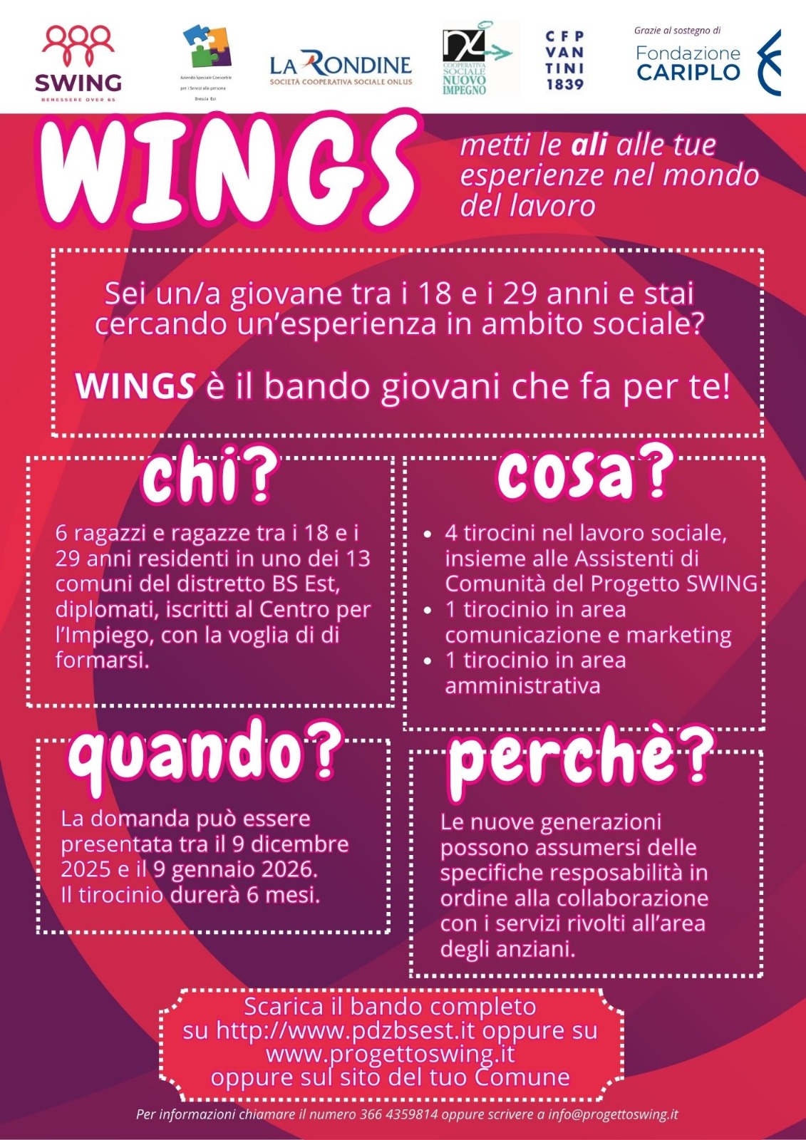 In allegato il bando "WINGS", promosso nell'ambito del Progetto . Si tratta di un’opportunità concreta di inserimento lavorativo e formativo che potrebbe rivelarsi uno strumento prezioso per l'attivazione di alcuni giovani residenti nei nostri territori.